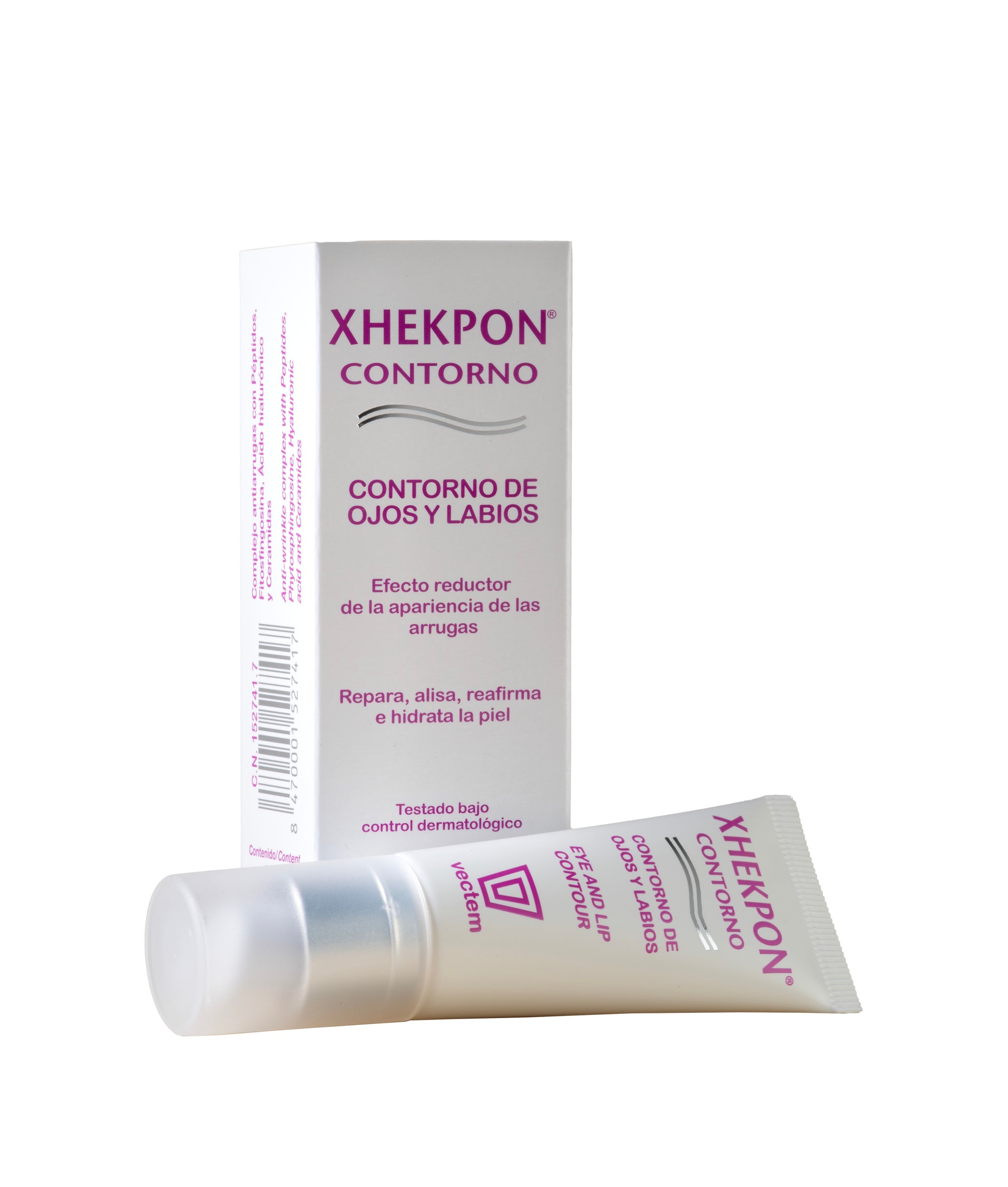 Crema Xhekpon Contorno, formulada con COLÁGENO HIDROLIZADO, PÉPTIDOS, ÁCIDO HIALURÓNICO, CERAMIDAS y aceite rico en ÁCIDO LINOLEICO, está especialmente diseñada para el cuidado del contorno de ojos y labios.